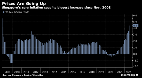 该数据支持对新加坡金管局本月早些时候的政策紧缩决定构成支持。这是新加坡金管局今年第三次收紧政策,以应对物价压力。分析师预计通胀尚未见顶。此前,新加坡金管局本月上调了2022年平均核心通胀率预期,从2.5%-3.5%上调至3%-4%。